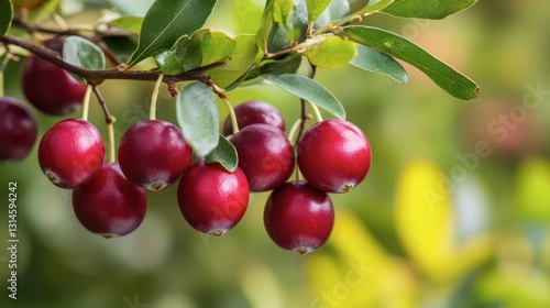 Cluster of cranberries hanging from thin branches, soft focus background for depth
