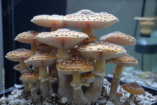Cluster of spotted cream-colored mushrooms growing from soil, featuring umbrella-shaped caps with white speckles and delicate gills underneath, captured in natural light.