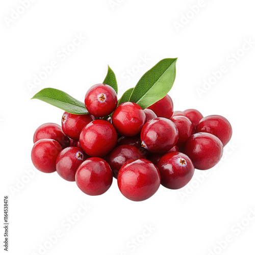cluster of vibrant red berries. likely cranberries. arranged artfully with a few green leaves the bright color and glossy appearance suggest freshness. making it suitable for use in food-related conte