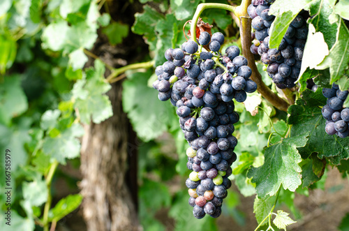 Clusters of ripening purple grapes hang beneath lush green leaves in a sunny vineyard, symbolizing agriculture, harvest, and the beauty of winemaking traditions.