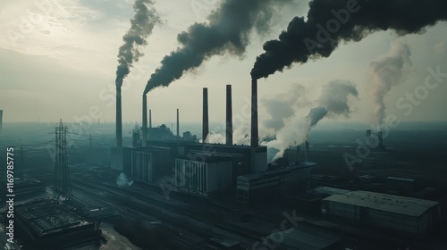 Coal power plant with high pipes emitting black smoke, highlighting the environmental pollution and atmospheric impact of industrial activities.