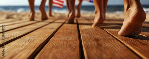 Coastal Boardwalk Stroll Barefoot with American Flags on Summer Day