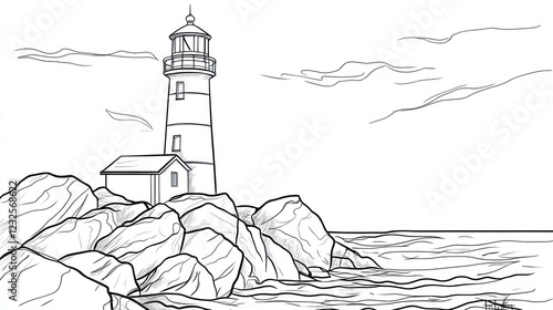 Coastal Lighthouse on Rocky Shore, Calm Sea, Cloudy Sky - Coloring Page