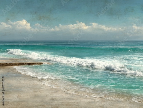 Coastal scene, vintage-style. Tranquil beach, turquoise waves