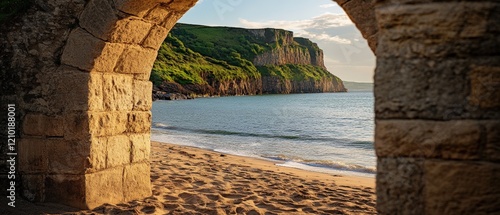 Coastal view through stone archway at sunset, showcasing sandy beach, calm waters, and lush greenery on cliffs, ideal for travel and nature photography.