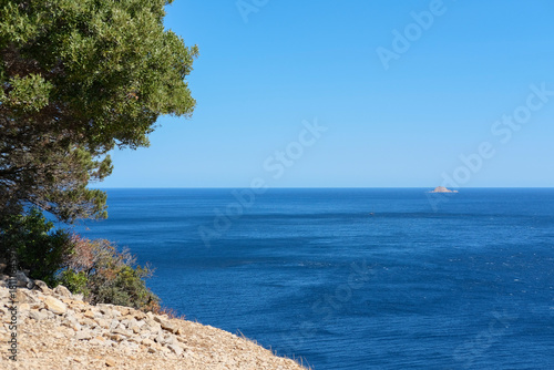 Coastal view with rocky slope, green trees, and calm deep blue sea under a clear sky.
