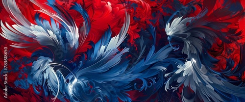 Cobalt gray plumes swirling in a symphony of colors over a captivating tapestry of ruby red.