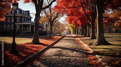 Cobblestone Pathway Under a Canopy of Vibrant Autumn Leaves, Leading to a Historic House With Glowing Windows