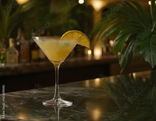 cocktail in the bar, Cocktail on a marble table with tropical plants in dimly lit bar setting at night