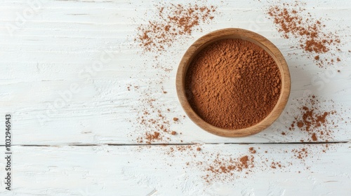 Cocoa Powder in Wooden Bowl on White Table