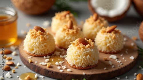 Coconut almond desserts on wooden board surrounded by honey and shredded coconut, creating an inviting and tasty presentation