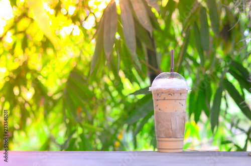 coffee on wood table with forest background in weekend time.