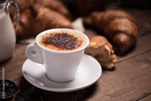 Coffee cup with a croissant on a rustic wooden table