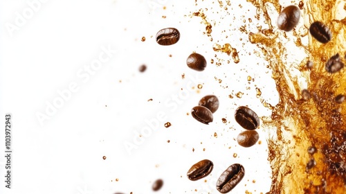 Coffee splashing with beans in dynamic motion.