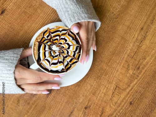 Coffee with spider web pattern on top of foam in white cup and girl's hands on wooden table background, top view