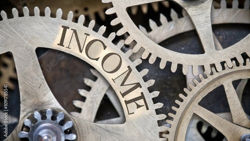 Cogs in a Machine A machine with cogs each engraved with the word income illustrating how different sources work together for financial stability.