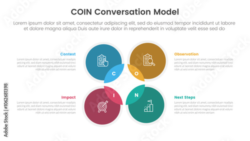 COIN Conversation Model infographic 4 point stage template with venn diagram blending and circle on outline center for slide presentation