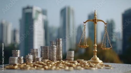 Coins ascend to a golden scale against a blurred cityscape, symbolizing balance and prosperity