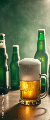 Cold beer in glass on counter desk pub., a lots of bottles in the background. Generated AI