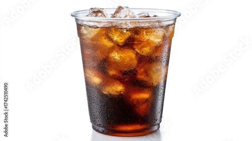 Cold cola drink with melting ice cubes in clear disposable plastic cup showing condensation droplets, offering refreshing bubbly beverage on white background