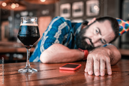 Cold dark beer. Bearded dark-haired man looking at glass of nice cold dark beer while sitting alone in the bar