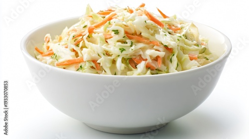 Coleslaw styled for commercial stock photography, isolated on white background, soft shadows, clean clarity