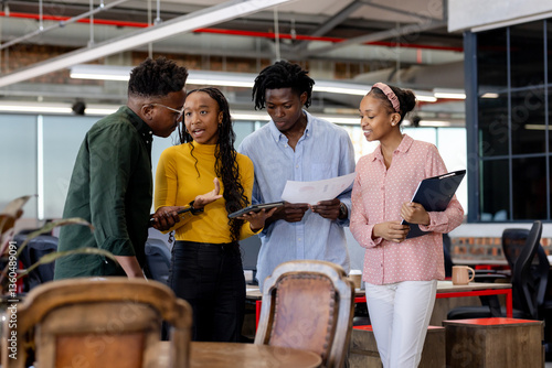 Collaborating in office, diverse team discussing project details using documents and tablet