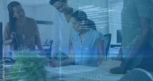 Collaborating women analyzing documents on laptop at office desk, with code and graph overlay