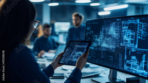 Collaborative BIM session with professionals using tablets and digital displays to enhance construction planning