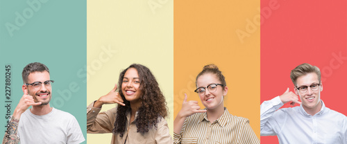Collage of a group of people isolated over colorful background smiling doing phone gesture with hand and fingers like talking on the telephone. Communicating concepts.