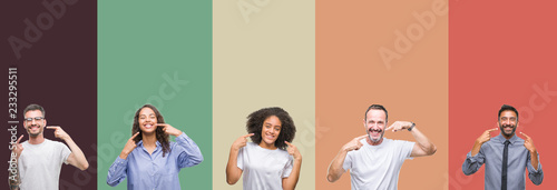 Collage of group of young and senior people over colorful isolated background smiling confident showing and pointing with fingers teeth and mouth. Health concept.