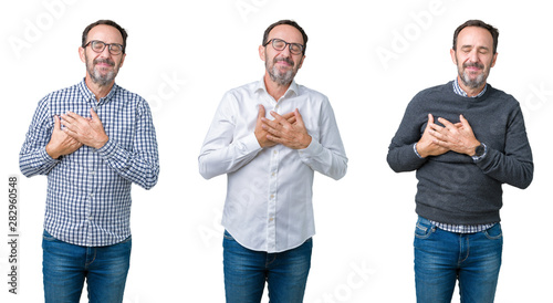 Collage of handsome senior business man over white isolated background smiling with hands on chest with closed eyes and grateful gesture on face. Health concept.