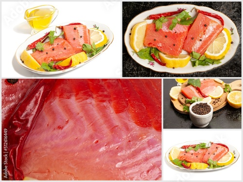 Collage with Pieces of lightly salted trout with herbs, spices and lemon