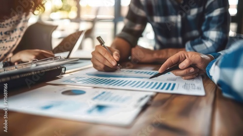 Colleagues analyze graphs and data while discussing project details at their workspace
