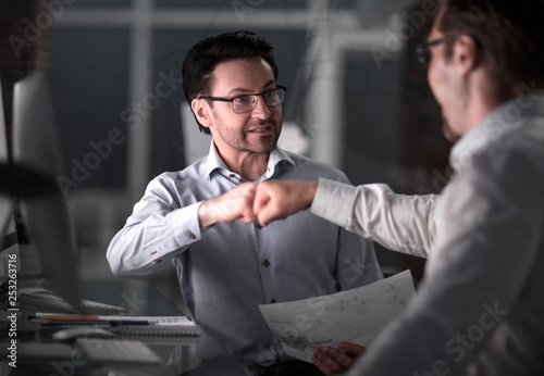 colleagues give each other a fist.