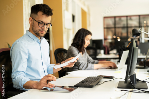 Colleagues in office. Businesswoman and businessman discussing work in office.