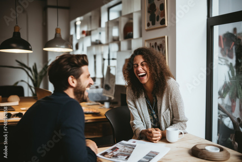 Colleagues man and woman laugh while sitting at the table in the office.