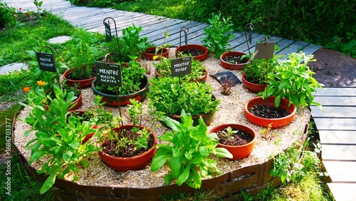 Collection de diverse menthe en pot dans le jardin de la saline royale d’Arc-et-Senans dans le Doubs France