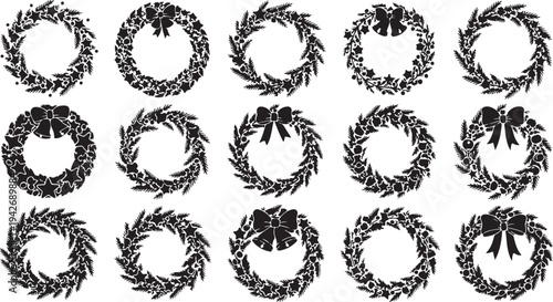 Collection of black and white Christmas wreath illustrations