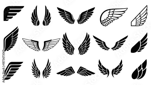 Collection of Black and White Stylized Wing Designs, Isolated on White Background