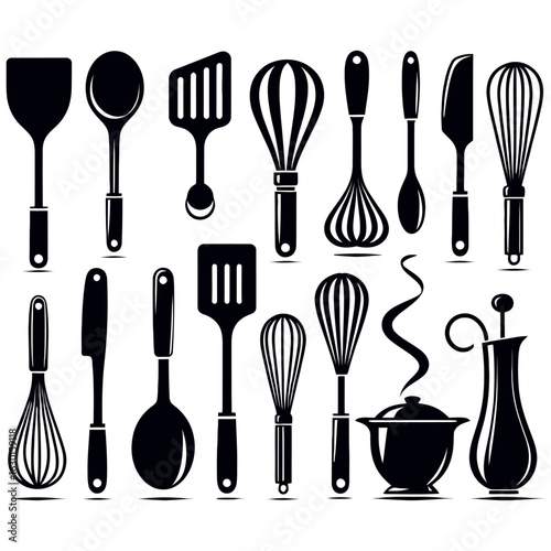 Collection of black kitchen utensils and cooking tools isolated on white background