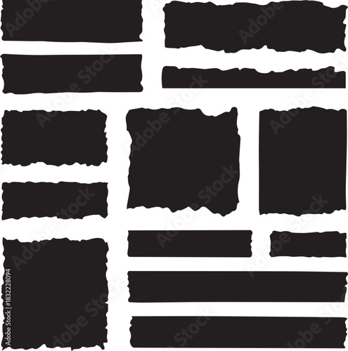 Collection of black paper scraps with torn edges arranged on a white background