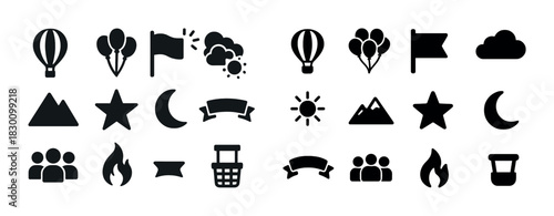 Collection of black silhouette icons: balloons, banners, clouds, and stars