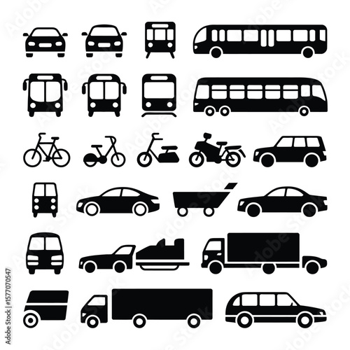 Collection of Black Silhouette Icons Depicting Various Modes of Transportation Including Cars Buses Trains Bikes Trucks and More 1