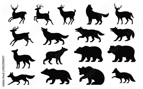 Collection of black silhouettes of forest animals including deer wolves bears and foxes on white background
