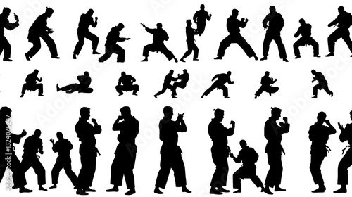 Collection of black silhouettes of people practicing judo. Shadows of the fighting men on a white background. Martial arts illustrations.