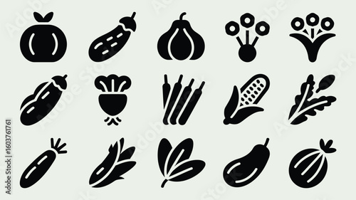 Collection of Black Vegetable and Flower Icons on Light Gray Background Simple Flat Glyph Style Illustrations of Various Produce Items