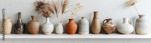 Collection of ceramic vases on white shelves, displaying a variety of shapes and earth tones, perfect for a minimalist interior