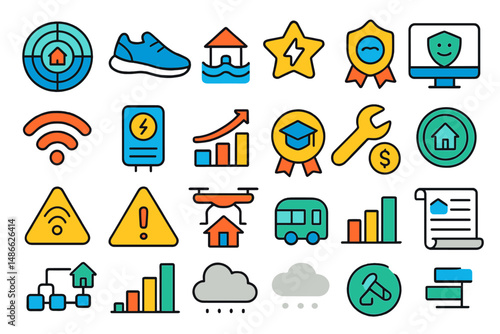 Collection of colorful icons representing technology, education, and various activities in a modern design style