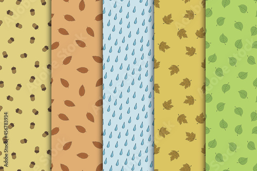 Collection of colorful seamless autumn patterns. Hand drawn doodle design. Nature endless backgrounds